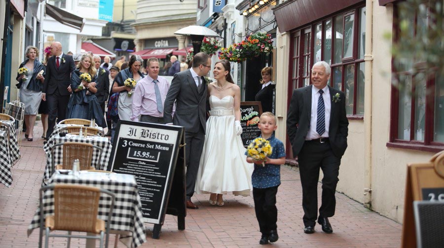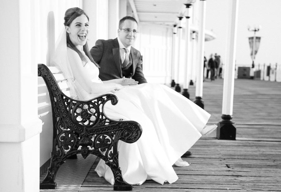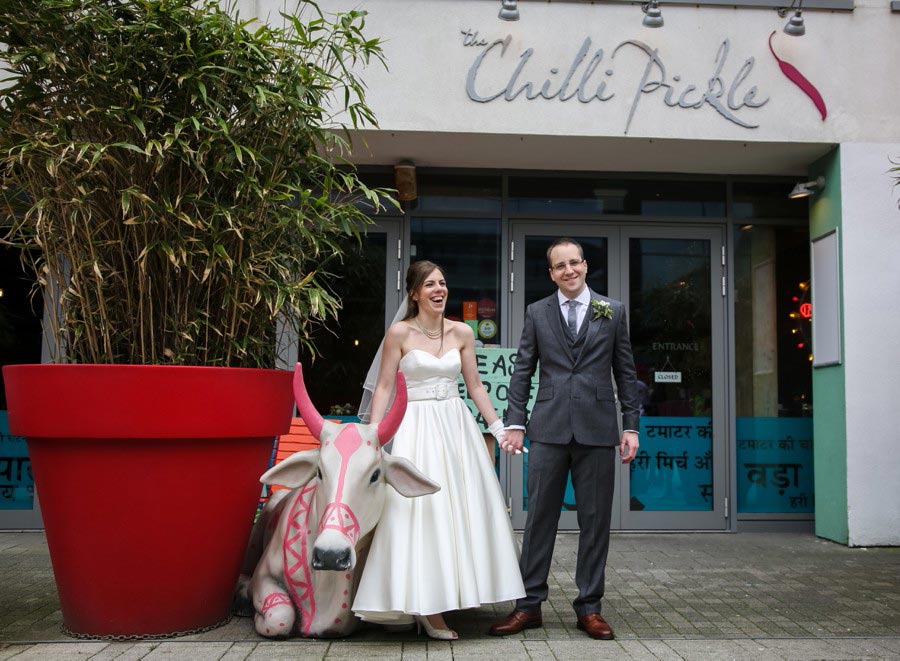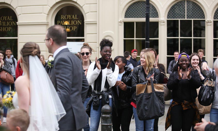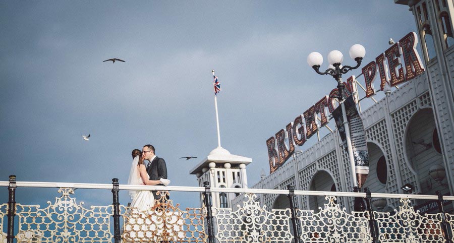 As a Brighton wedding photographer there’s nothing better than a Brighton wedding on a warm and sunny spring day, and last weeks wedding for Emily and Joe was a beauty! I was spoilt for opportunities with the day’s plans and I made sure I took advantage of every one. My day started in Shoreham for bride’s preparations, before taking a wedding taxi to Brighton Town Hall for the ceremony. The plan then was for a short photo session outside the registry office before meandering through the streets to our next and most exciting Brighton wedding reception venue the Chilli Pickle, and believe me it did not disappoint! The light, the decor, the smells, the flavours, the colours and the staff made this the most memorable and enjoyable reception and wedding breakfasts I have ever photographed. Simply amazing! The next plan was to meander through the streets to Pub Du Vin for the evening reception photographing the bride and groom at various sites along the way, including the Golden Gallopers Carousel and the Brighton Pier! Topping off an incredible day was a relaxed and comfortable evening wedding reception at Hotel Du Vin and Pub Du Vin, another favourite Brighton wedding venue of mine. Phew, what a fun packed day and what varied and wonderful set of wedding images. Enjoy!! I must make a special mention to my friend and wedding client, the super talented make-up artist Jenna West from Jenna West Make-up, to Streamline Taxis for sending such a lovely driver and finally to another friend and wedding client, Katie Smith-Pope for the fabulous bridal party hair styling.