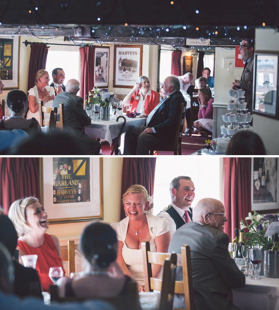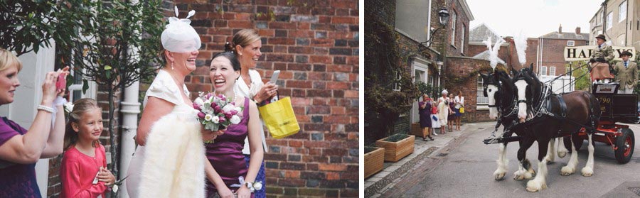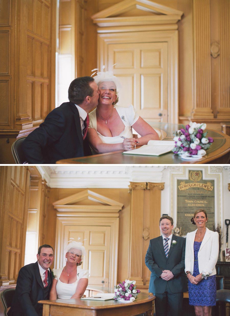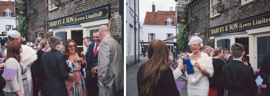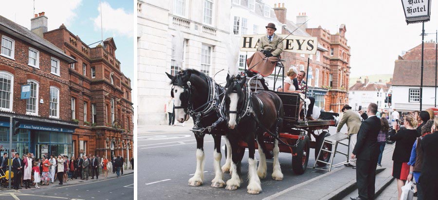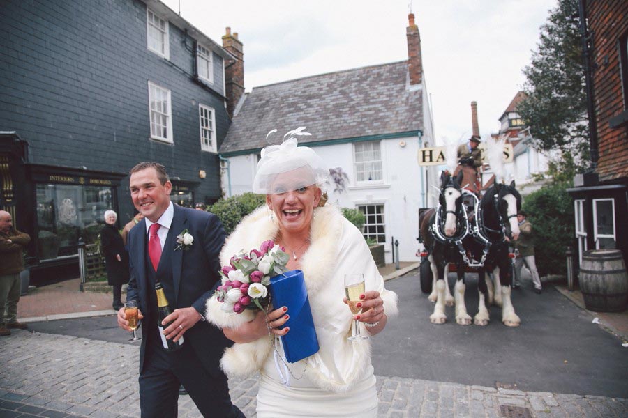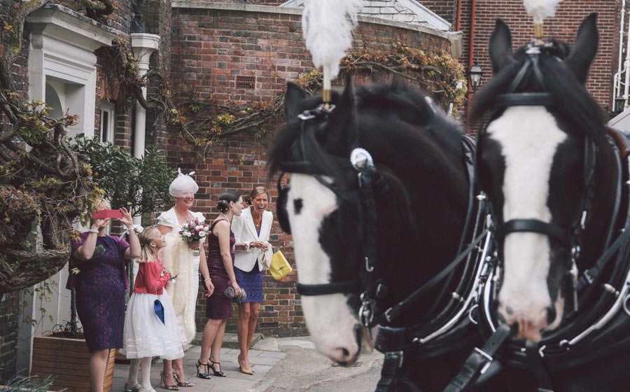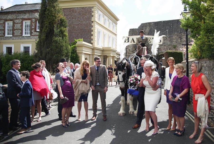 If you love Lewes and you love weddings, then you’ll love Claire and Chris’s Lewes wedding, that has to rate as the most fun and relaxed wedding I have ever shot! The fun started with bride’s preparations at Pelham House, setting the scene for the day and awaiting the arrival of the bridal parties ‘traditional’ mode of transport. The reception was being held at the Harvey’s Tavern, so what better way to get there than by the Harvey’s Dray, complete with two magnificent Shire horses. The dray picked up the bridal party and off they trotted around the block, before pulling up outside Lewes Town Hall for the wedding ceremony. The ceremony room was a real treat, however the ceremony itself was an irresistable mix of emotion and raw excitement, a wonderful way to start a new life together. Next, a short walk to Lewes Castle for some photos and to soak up some Lewes History, before the bride and groom were whisked away to the reception, leaving us to gently stroll down to the river for the wedding breakfast and evening celebrations at the Harvey’s Tavern. Lovely warm weather, a pint of Harveys and delicious hearty food marked the start of an excellent reception for a fantastic couple who are full of the joys of life and so well suited! Here’s my take on this exciting day….