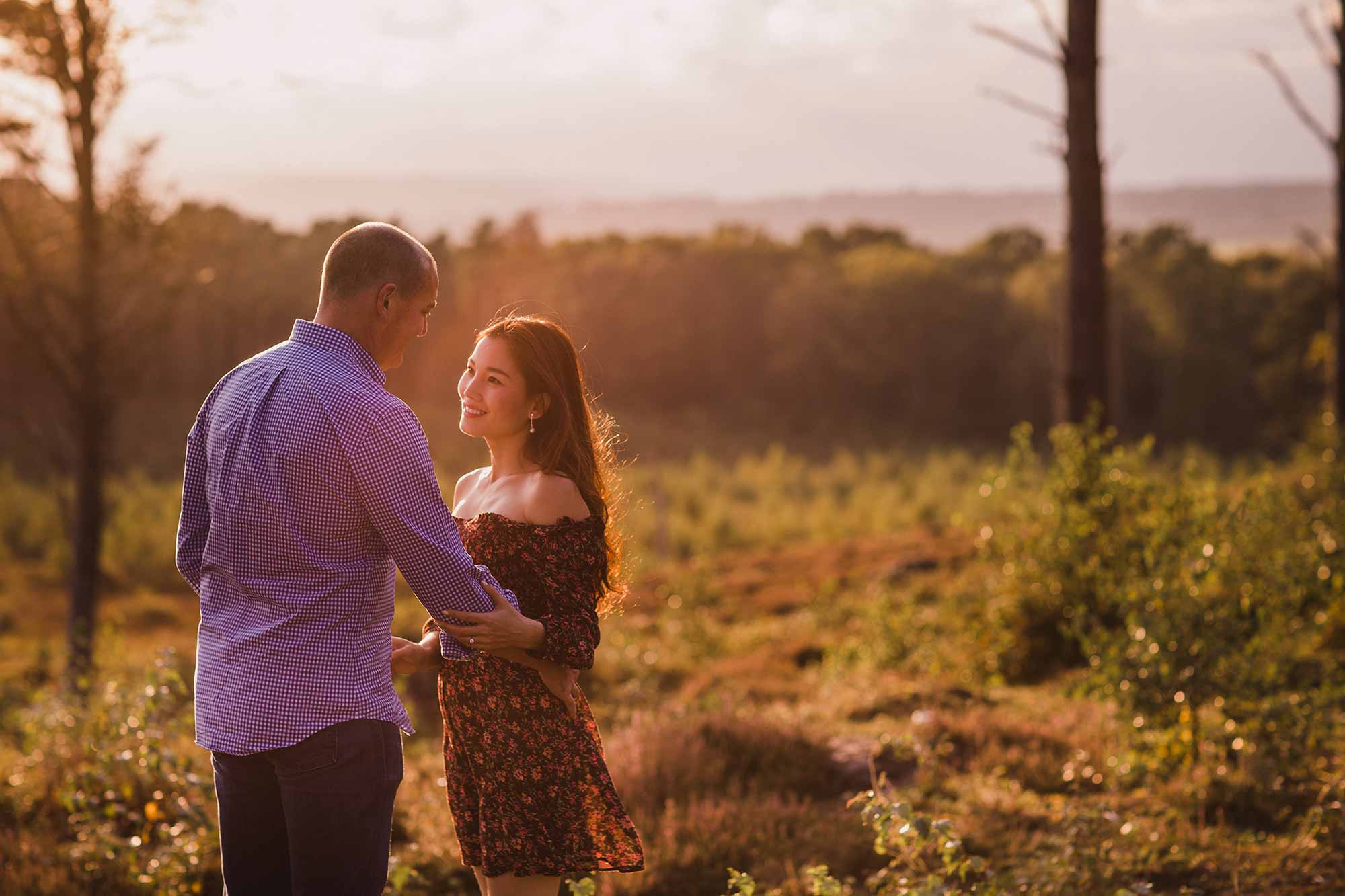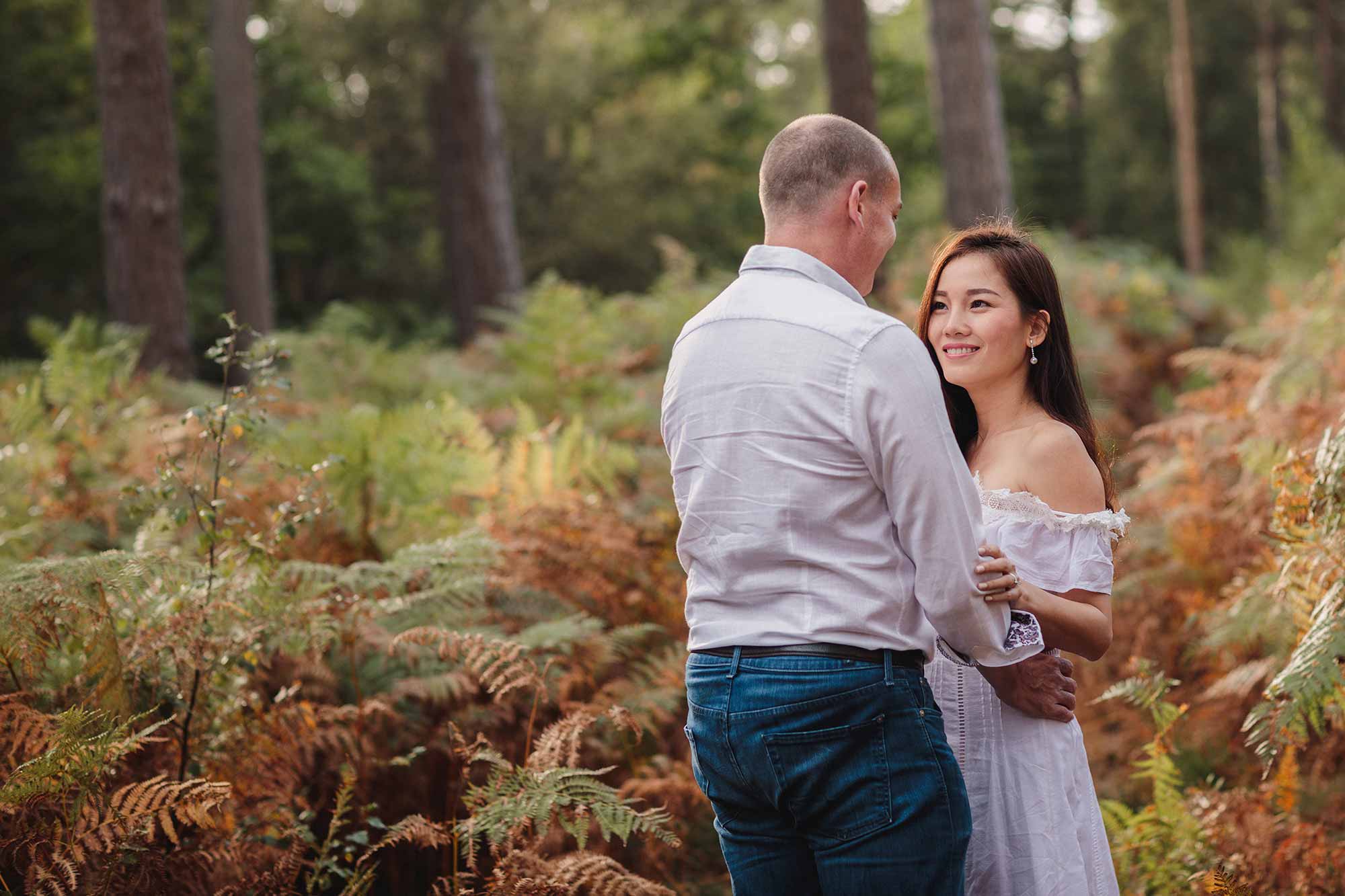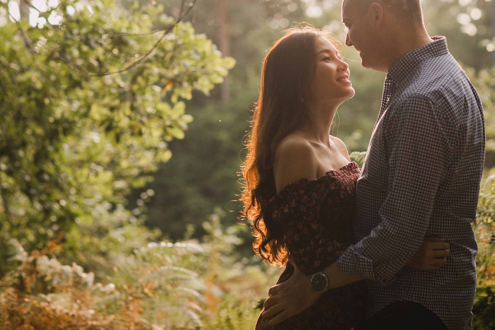 Jon first got in touch with me after I was recommended to them for their September wedding. Jon and Jessica live in Vietnam, so getting the logistics right for their pre-wedding shoot and wedding, during their 1 week visit to the UK was paramount! The plan was simple, but tight – hope for awesome weather for the Wednesday pre-wedding shoot, two days after their arrival, and hope for more awesome weather for their wedding on the following Saturday. The chances of good weather for both was pretty high in September, however I never dreamed the weather would be as fabulous as it was! We opted for a woodland shoot in Pulborough and I’m so glad we did because the light was amazing and the images were absolutely lovely, as you can see below. Pre-wedding shoots are not only a great way to learn how to feel comfortable in front of the camera, they’re an opportunity to experiment and a time to relax and have fun. Here’s my take on a glorious evening in beautiful woodland with a cracking couple!