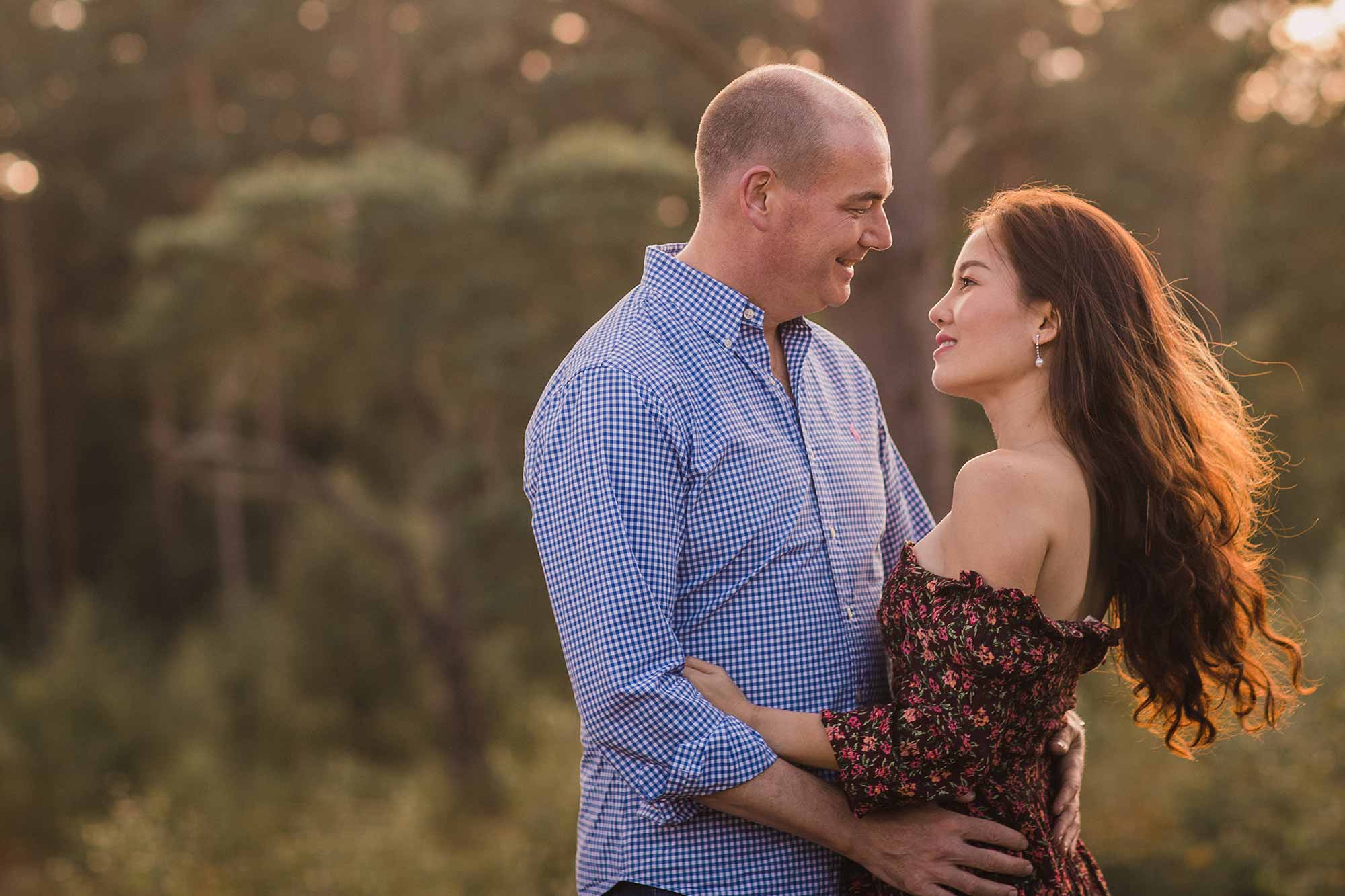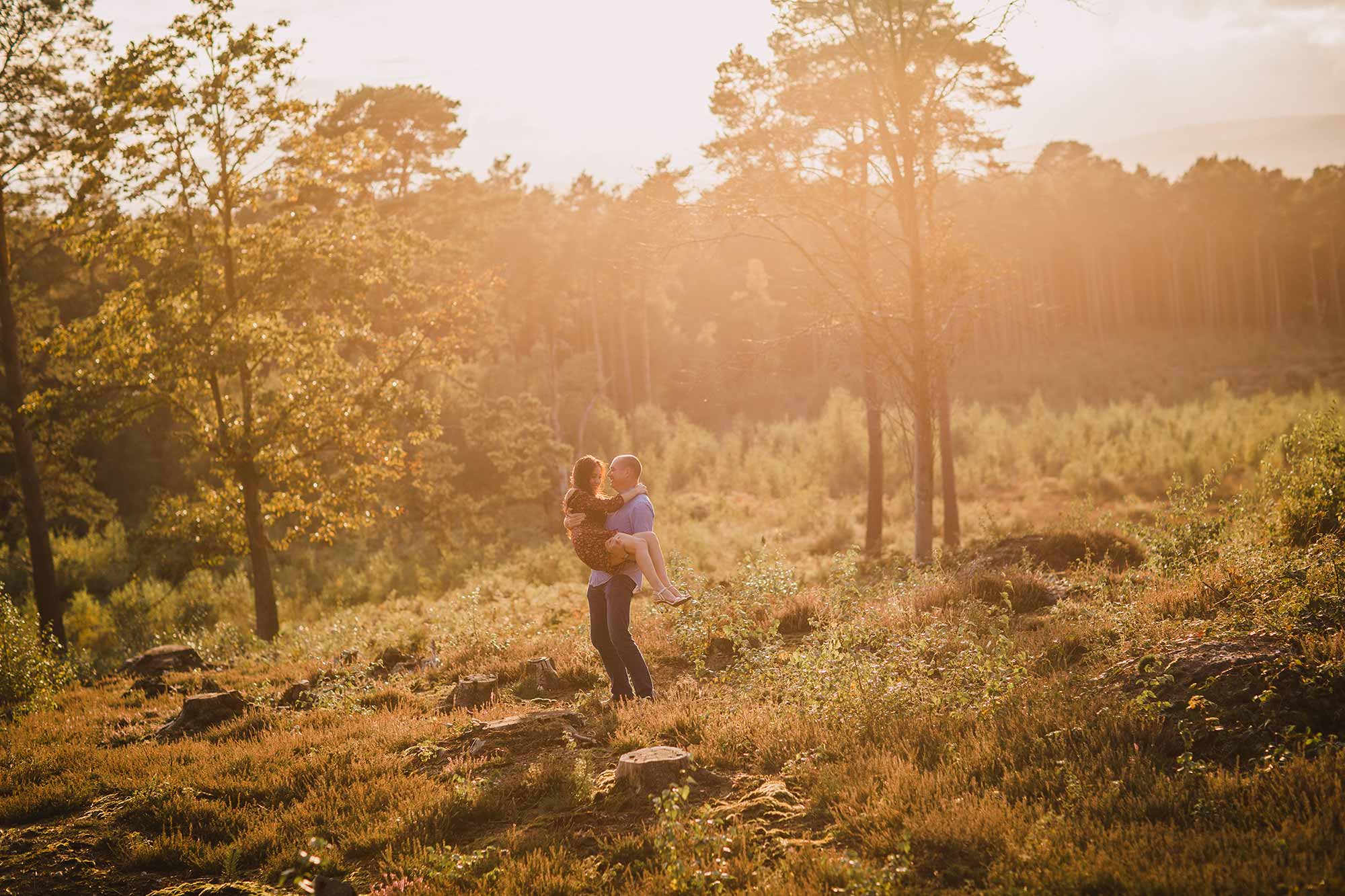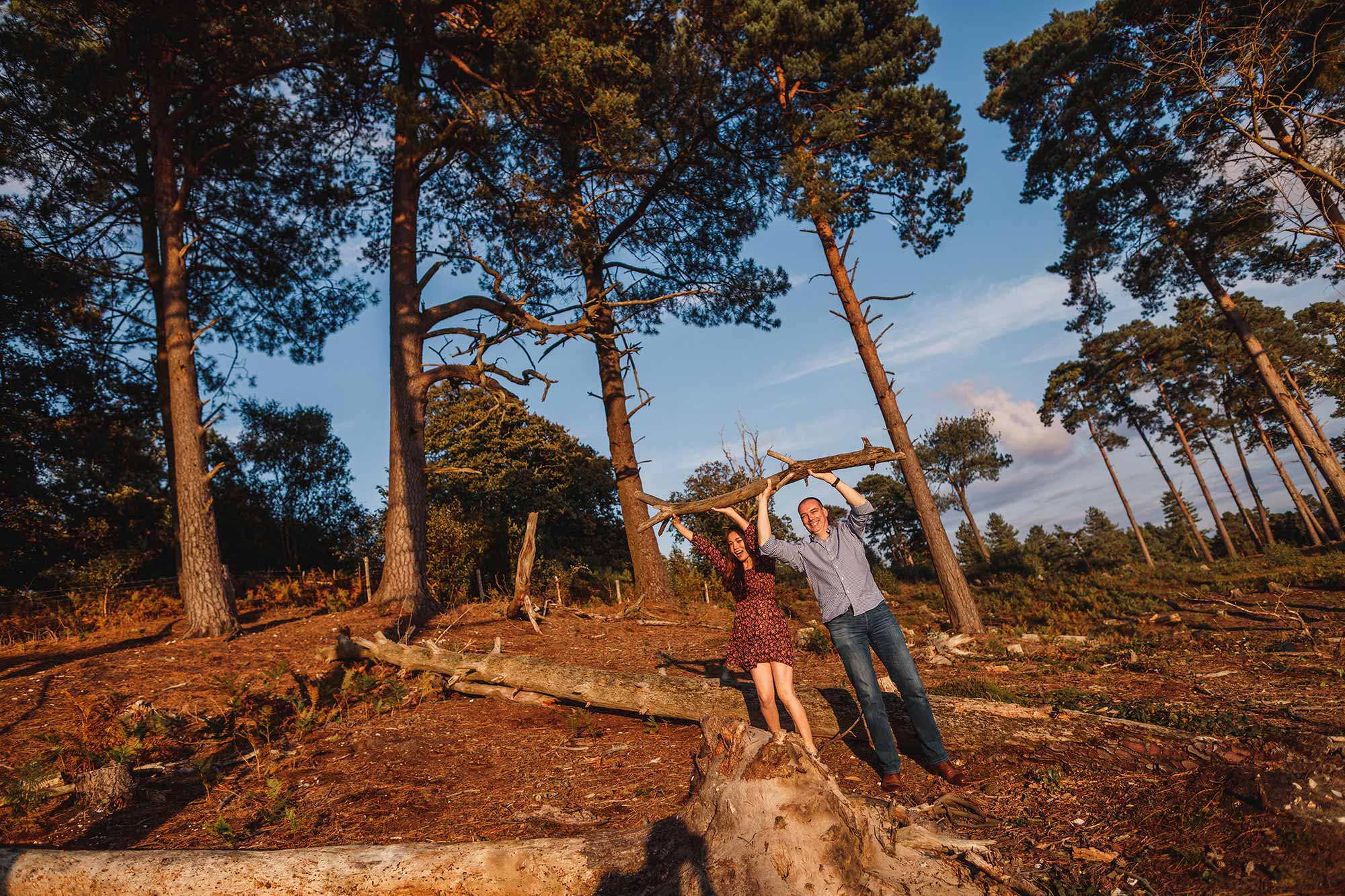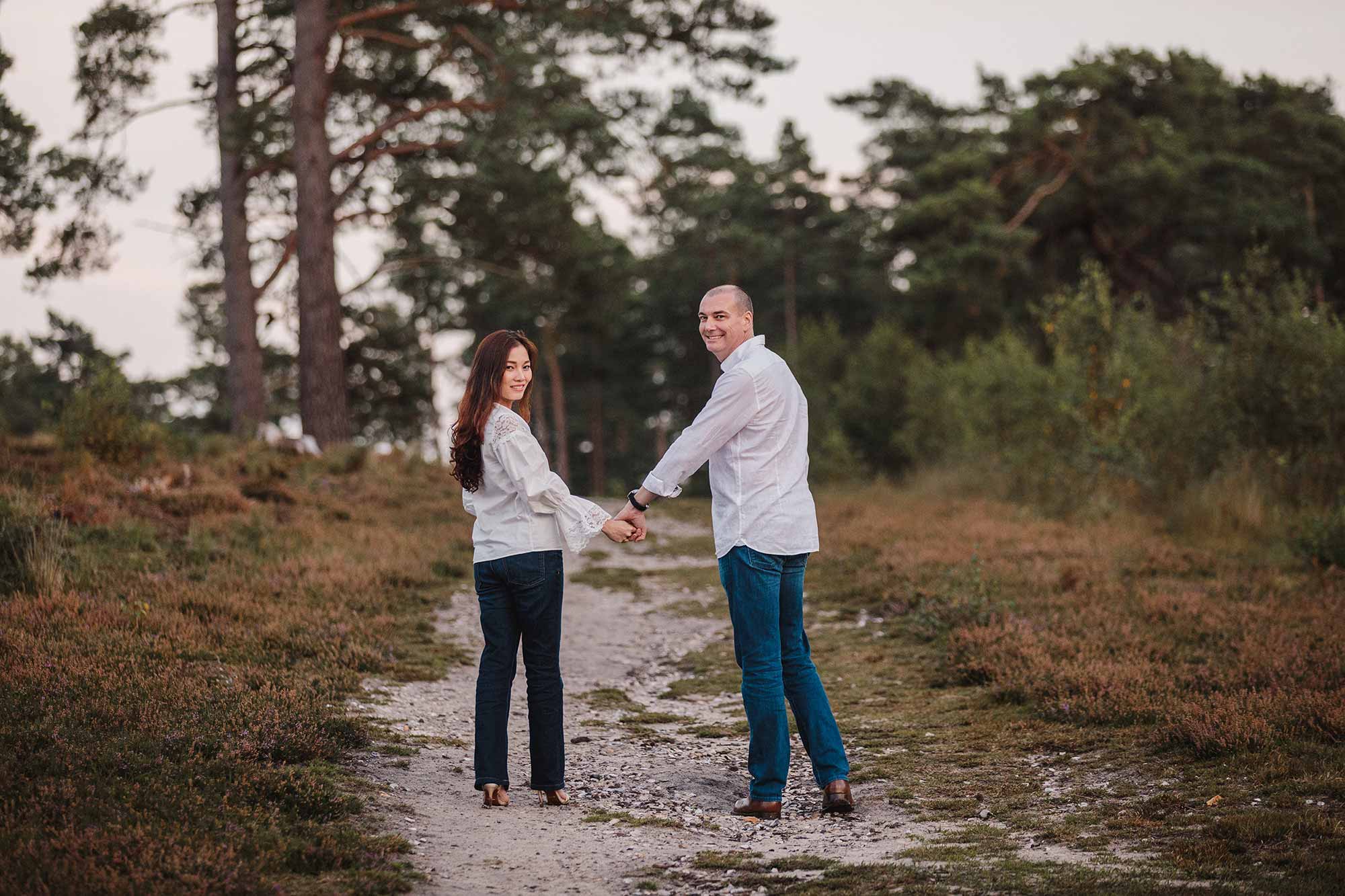Jon first got in touch with me after I was recommended to them for their September wedding. Jon and Jessica live in Vietnam, so getting the logistics right for their pre-wedding shoot and wedding, during their 1 week visit to the UK was paramount! The plan was simple, but tight – hope for awesome weather for the Wednesday pre-wedding shoot, two days after their arrival, and hope for more awesome weather for their wedding on the following Saturday. The chances of good weather for both was pretty high in September, however I never dreamed the weather would be as fabulous as it was! We opted for a woodland shoot in Pulborough and I’m so glad we did because the light was amazing and the images were absolutely lovely, as you can see below. Pre-wedding shoots are not only a great way to learn how to feel comfortable in front of the camera, they’re an opportunity to experiment and a time to relax and have fun. Here’s my take on a glorious evening in beautiful woodland with a cracking couple!